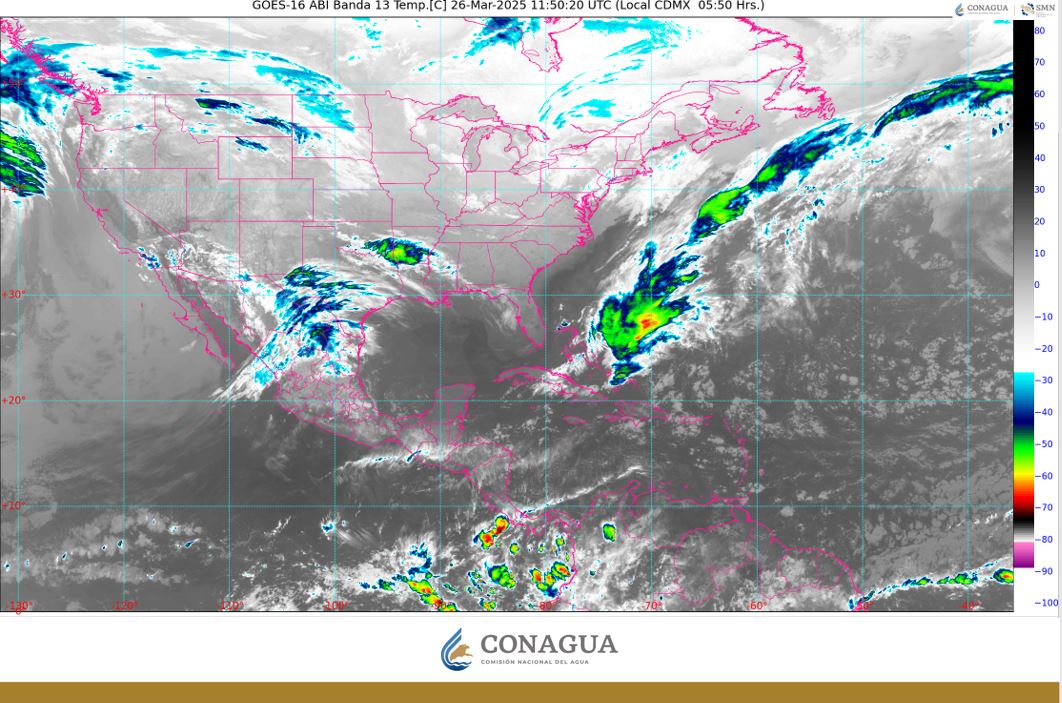 Finalmente, una circulación anticiclónica en niveles medios de la atmósfera mantendrá la onda de calor en zonas de Jalisco (centro, suroeste, sur y sureste), Colima (este), Michoacán (este, centro y suroeste), Morelos (sur), Guerrero (noroeste, centro y sur), Oaxaca (este, centro y sur) y Chiapas (centro, oeste y suroeste.