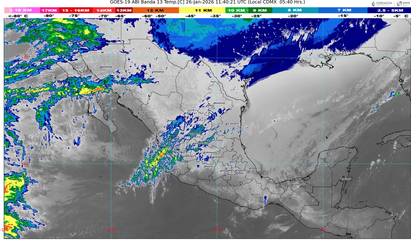 Simultáneamente, la masa de aire ártico asociada al sistema frontal, mantendrá el ambiente frío y bancos de niebla sobre entidades del norte, centro, oriente y sureste del país; así como ambiente muy frío a gélido en zonas serranas de la Mesa del Norte.